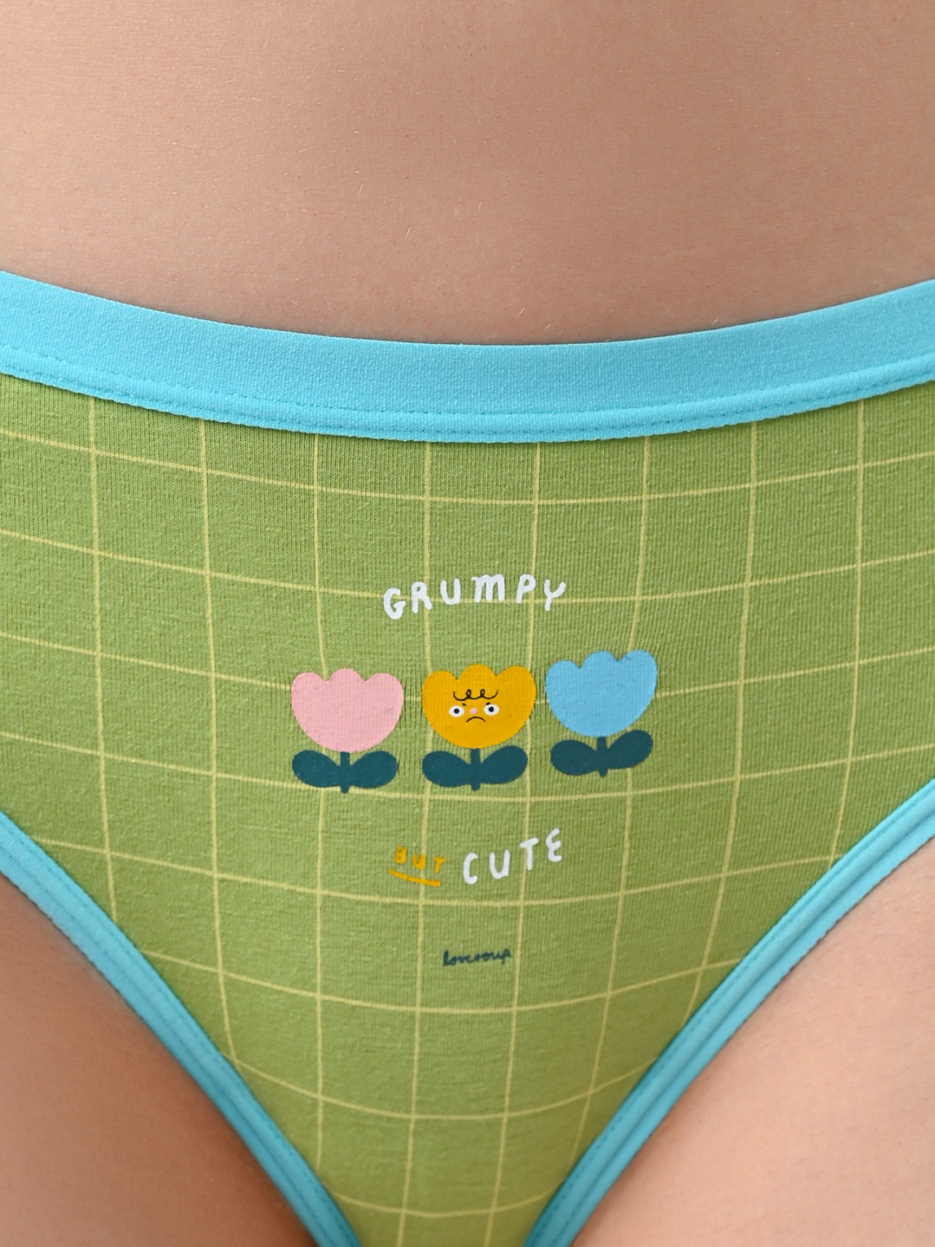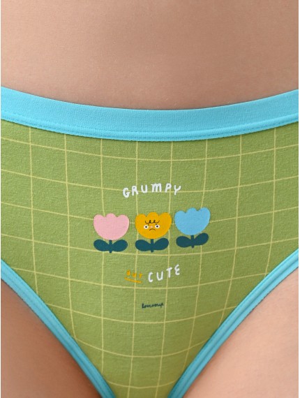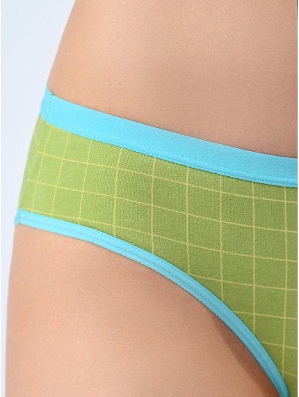 Трусы слипы женские 3226LUF бренда Indefini изготовлены из хлопка.Выполнены в зеленом цвете.Трусы средней посадки держатся на талии мягкой резинкой.На внутренней стороне трусов имеется хлопковая ластовица.На трусы нанесён принт в клетку с изображением цветочков и надписи.