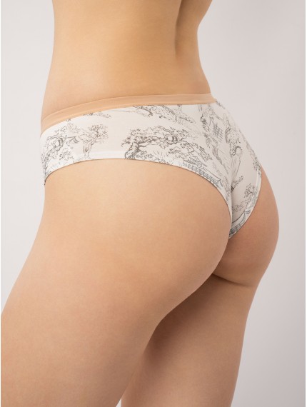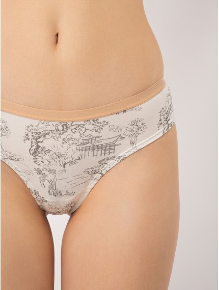 Выполнены в светло-бежевом цвете с изысканным принтом в стиле тоилет — черно-серый узор с изображением восточных пейзажей, деревьев и архитектурных элементов.Трусы средней посадки держатся на талии мягкой эластичной резинкой нежно-персикового оттенка, обеспечивающей комфорт без давления. На внутренней стороне трусов имеется хлопковая ластовица для дополнительного комфорта и гигиены.Идеальный выбор для ежедневного ношения — сочетание классического кроя, натурального материала и элегантного дизайна.