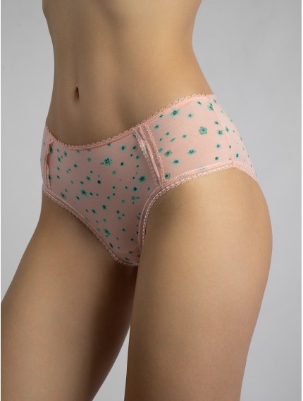 Нежно-розовые трусы-слипы от бренда Indefini с милым цветочным принтом. Модель выполнена из мягкой смеси бамбука и хлопка с добавлением эластана, что обеспечивает отличную посадку и комфорт в течение дня. Эластичная резинка и деликатная кружевная отделка по краям делают изделие особенно приятным в носке.