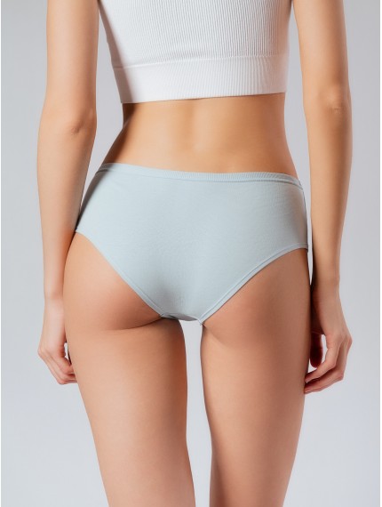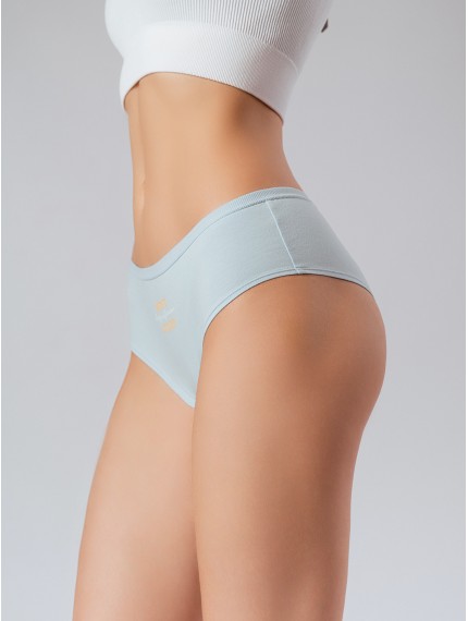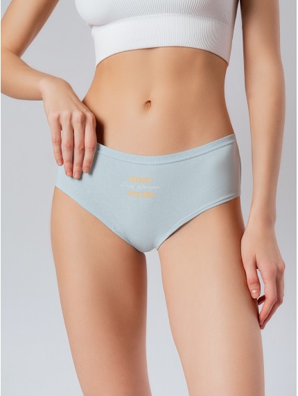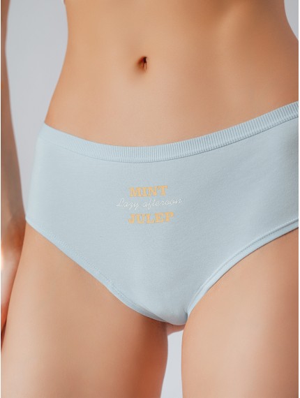 Трусы слипы женские 5010LUF бренда Indefini изготовлены из хлопковой ткани с добавлением эластана.Выполнены в светло-голубом цвете.Трусы средней посадки держатся на талии мягкой резинкой в тон основной ткани..На внутренней стороне трусов имеется хлопковая ластовица.На трусы нанесён принт с надписью «MINT», «Lazy afternoon» и «JULEP» в оранжево-бежевых тонах.