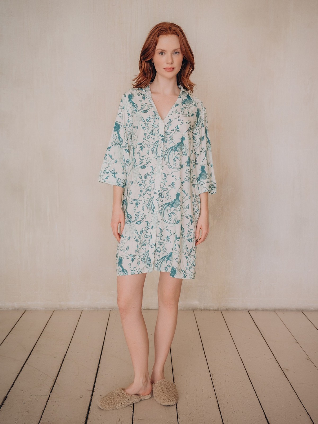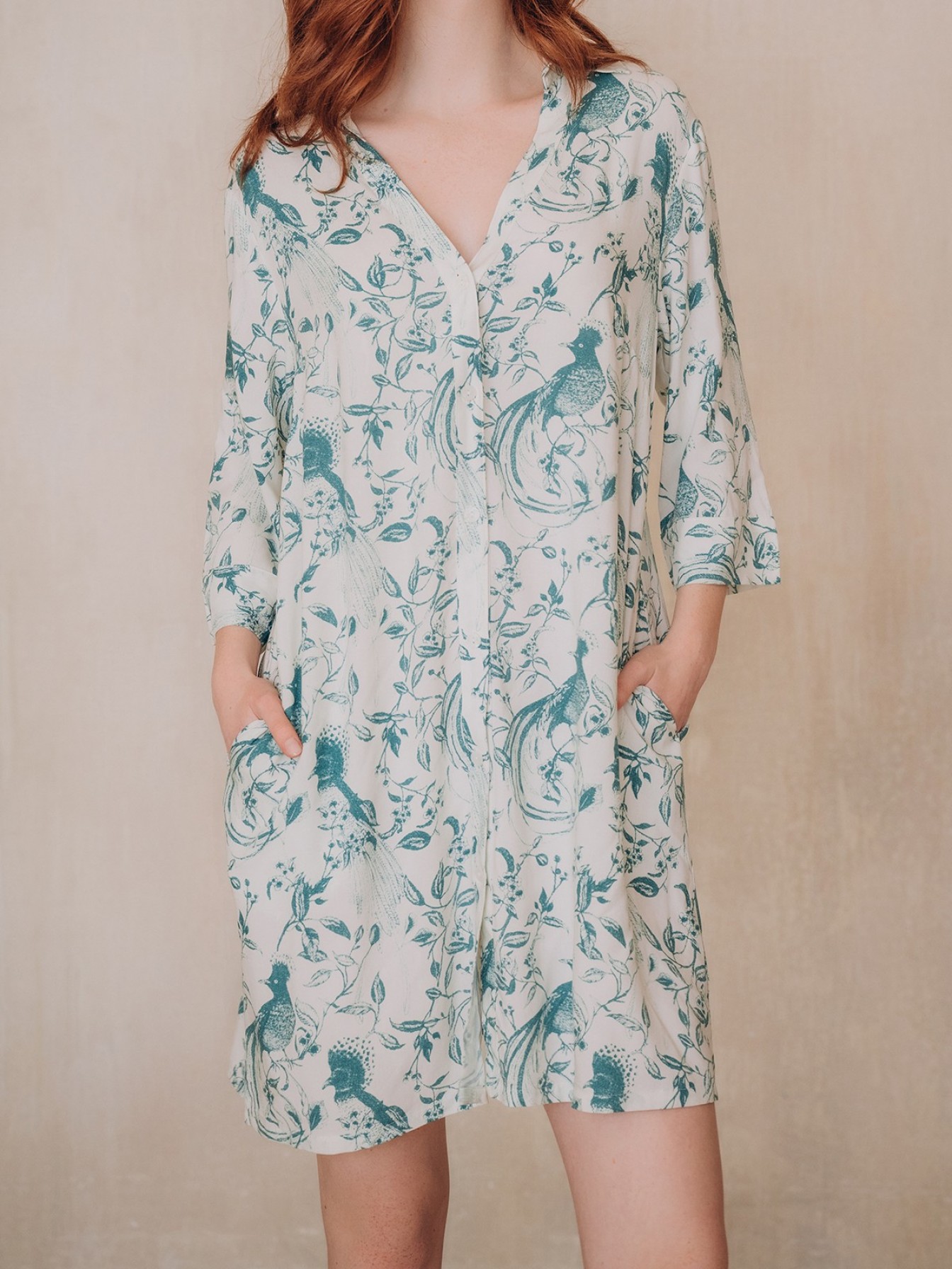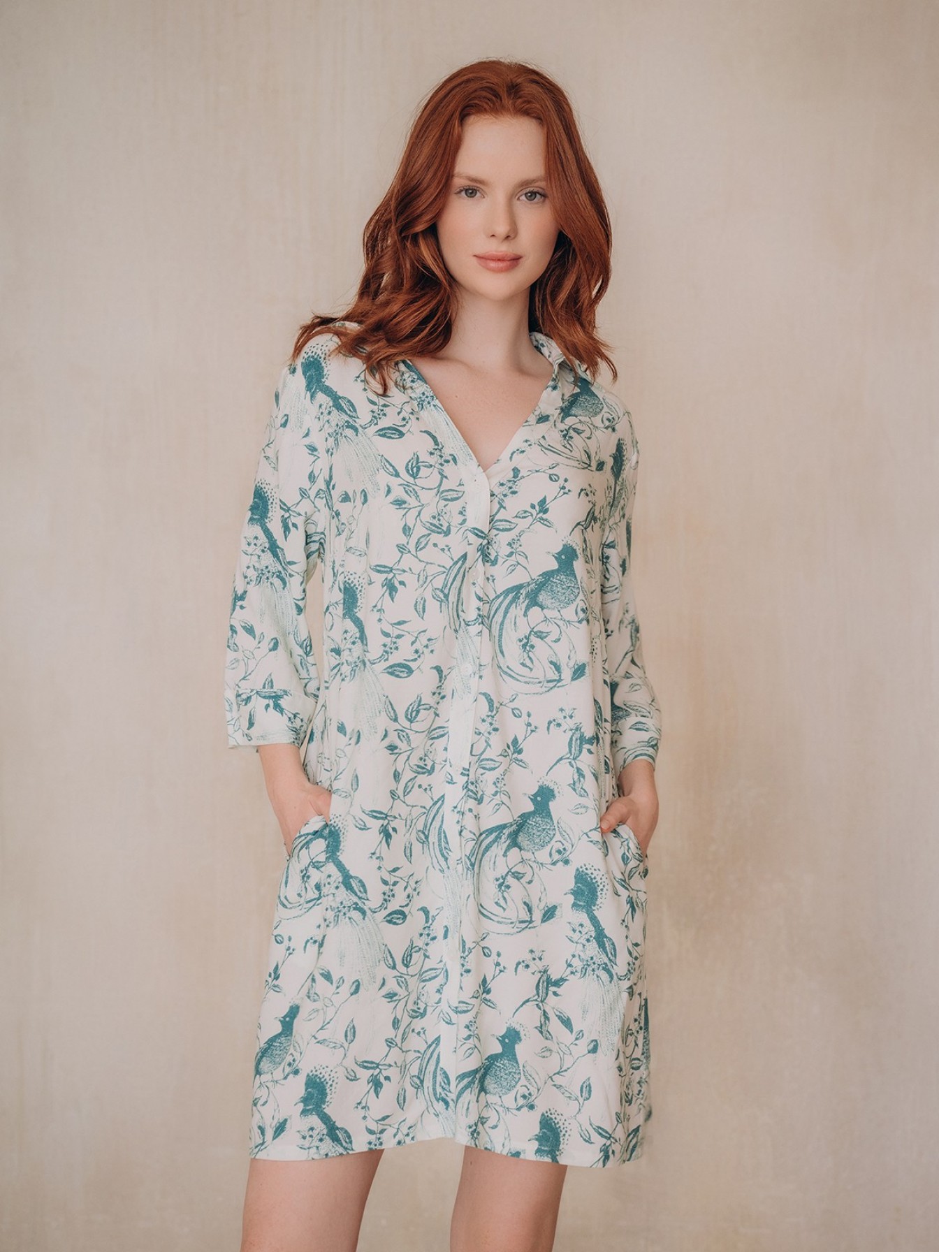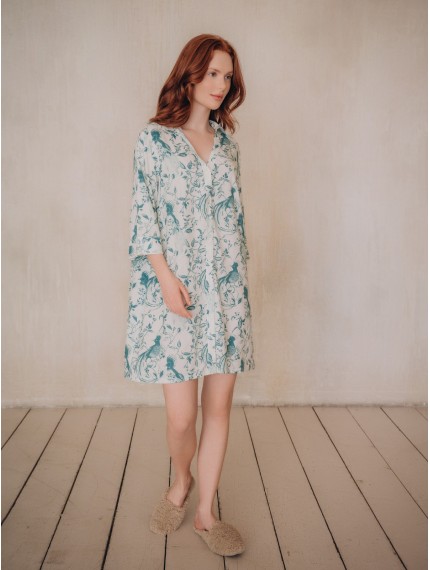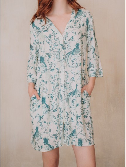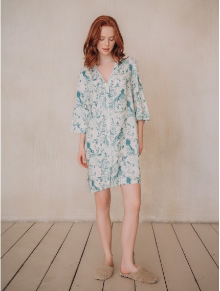Пляжная туника 5041YSQ бренда Indefini изготовлена из вискозы.Она имеет длинные рукава.Застёгивается на пуговицы в цвет ткани спереди.По бокам имеются два кармана.Пляжная туника выполнена в белом цвете с нанесенным на неё зеленым цветочным принтом.