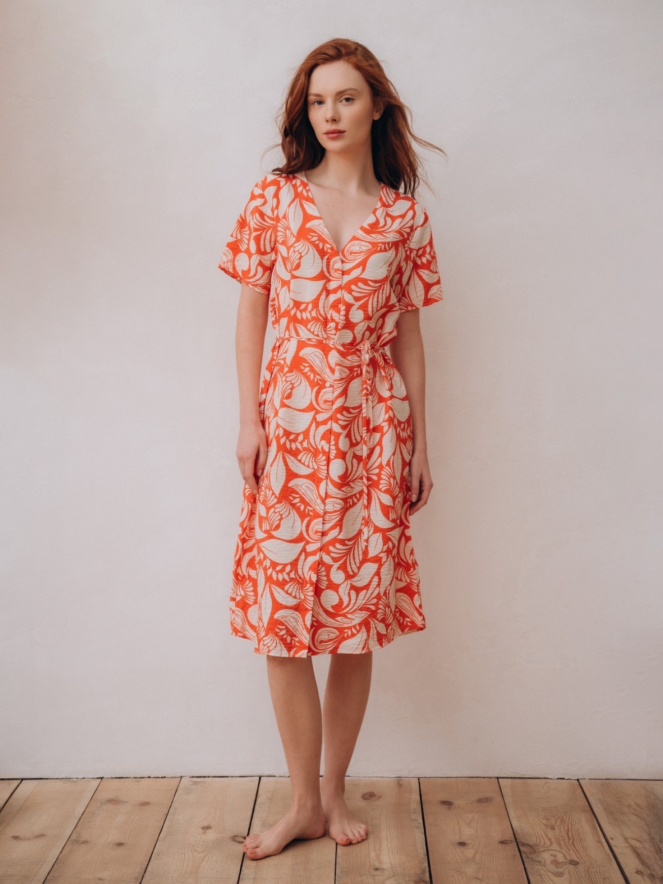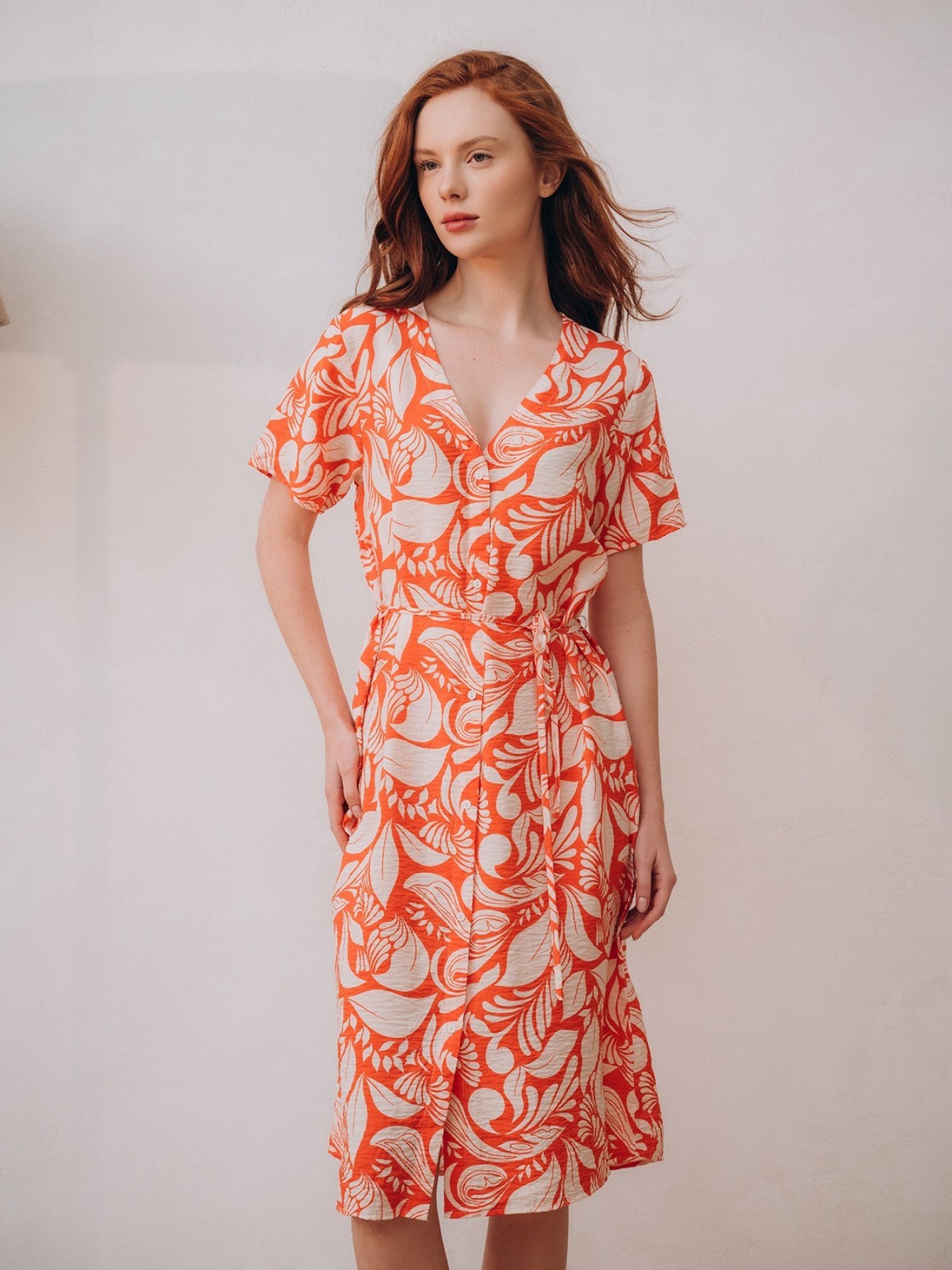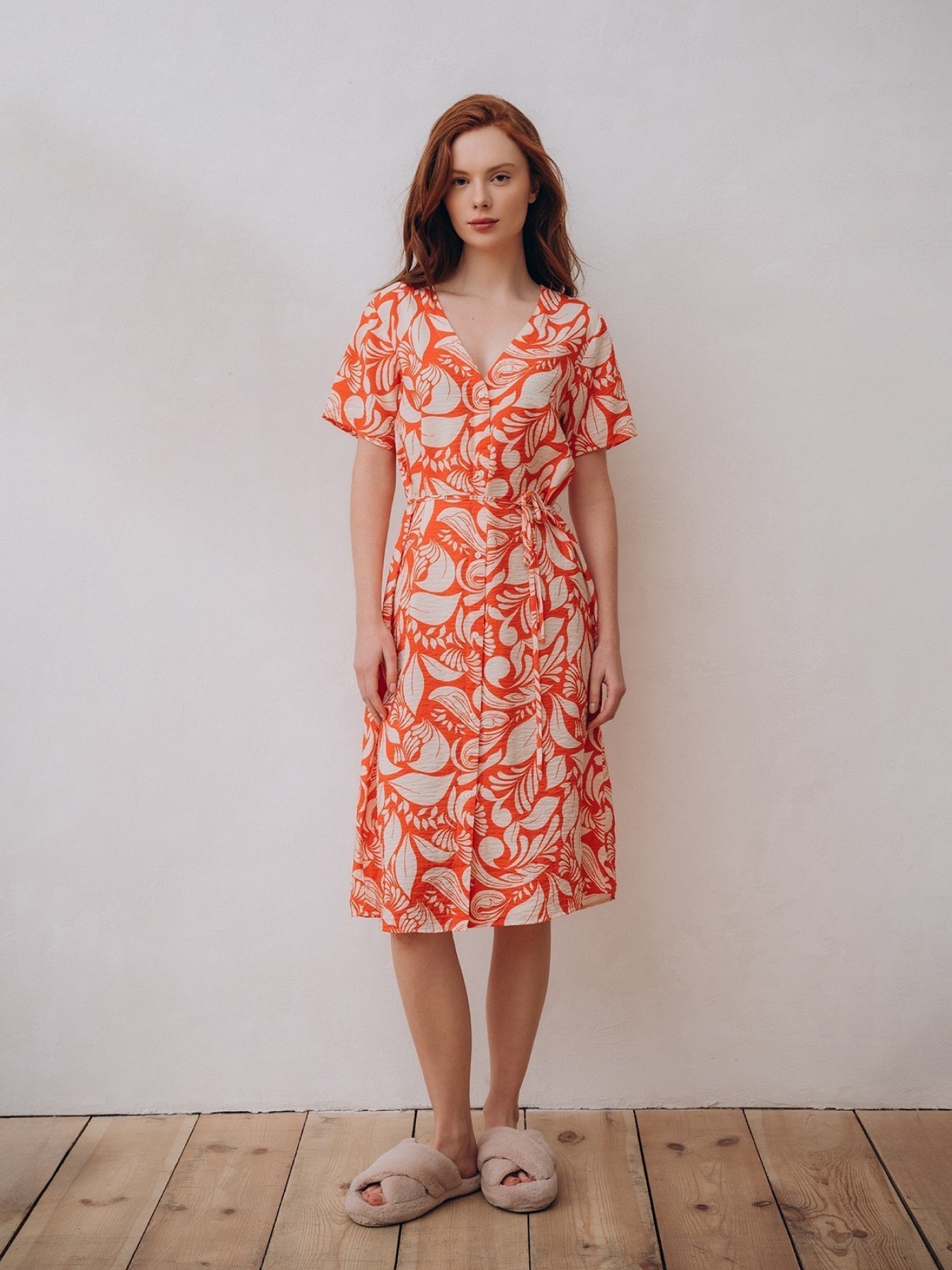Пляжная туника 5088YSQ бренда Indefini изготовлена из смеси вискозы и полиамида.Она выполнена в оранжевом цвете.Туника на пуговицах с короткими рукавами и прямым свободным кроем.К тунике прилагается тонкий пояс, завязывающийся на талии.На тунику нанесён белый принт с изображением листьев.