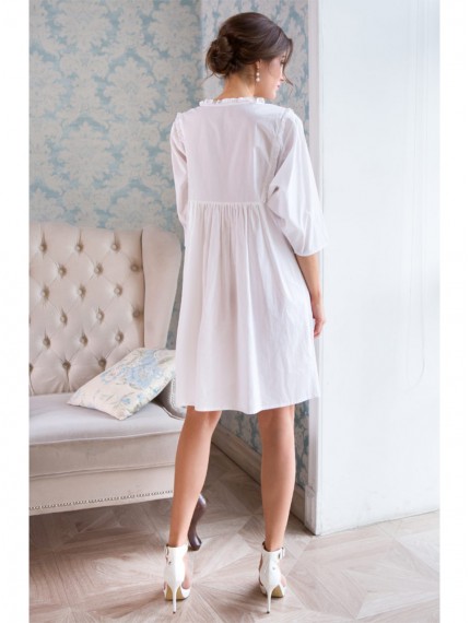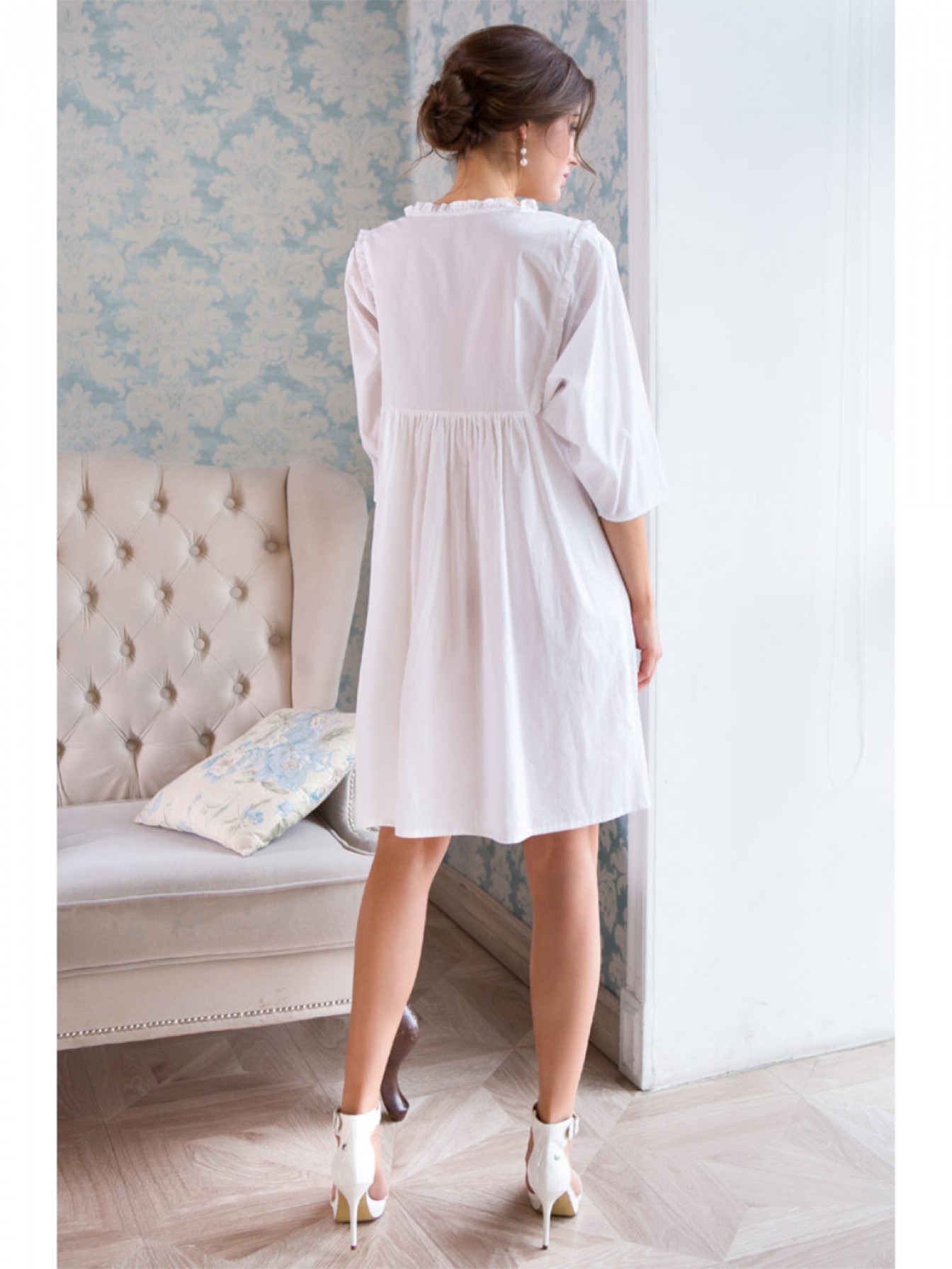 Хлопковая рубашка средней длины с широким рукавом 3/4 и декором в виде вышивки по лифу. Горловина декорированна узкой рюшей. На полочке расположена застежка-планка на перламутровых пуговицах. По лифу расположены вертикальные отсроченные защипы и ленты с вышивкой. По боковым швам и талии лиф оформлен узкой рюшей. Юбка рубашки на защипах по уровню талии.