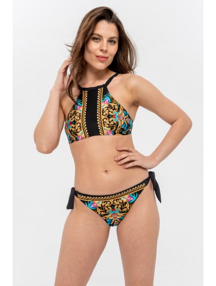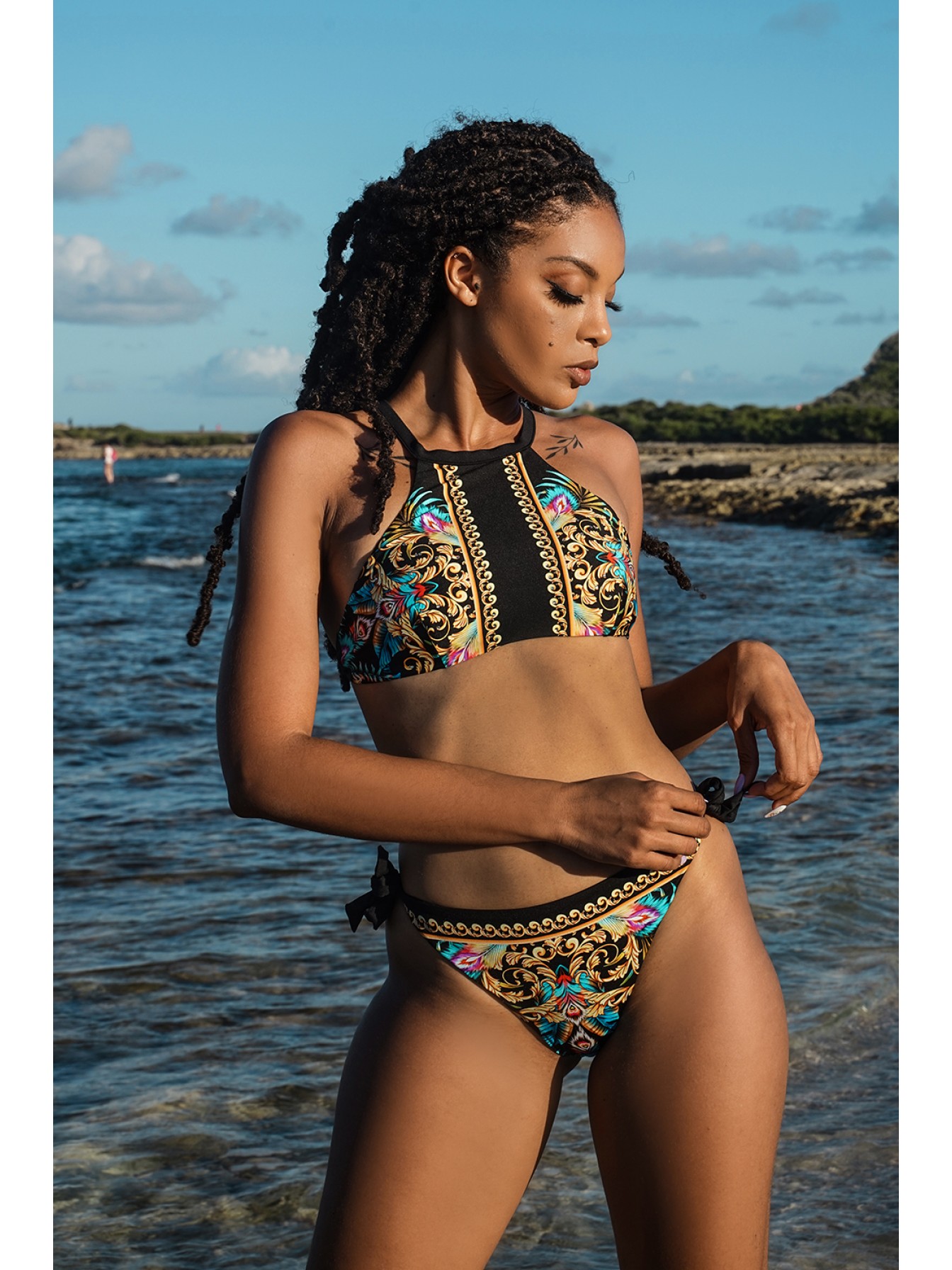 Топ- халтер со съемными вкладышами из коллекции Cruise Party оформлен оригинальным принтом и кристаллами. Бретели регулируются по длине, их можно отстегнуть и завязать за шеей, на спинке удобная застежка. Сочетайте с любыми плавками этой же коллекции для создания яркого пляжного образа.