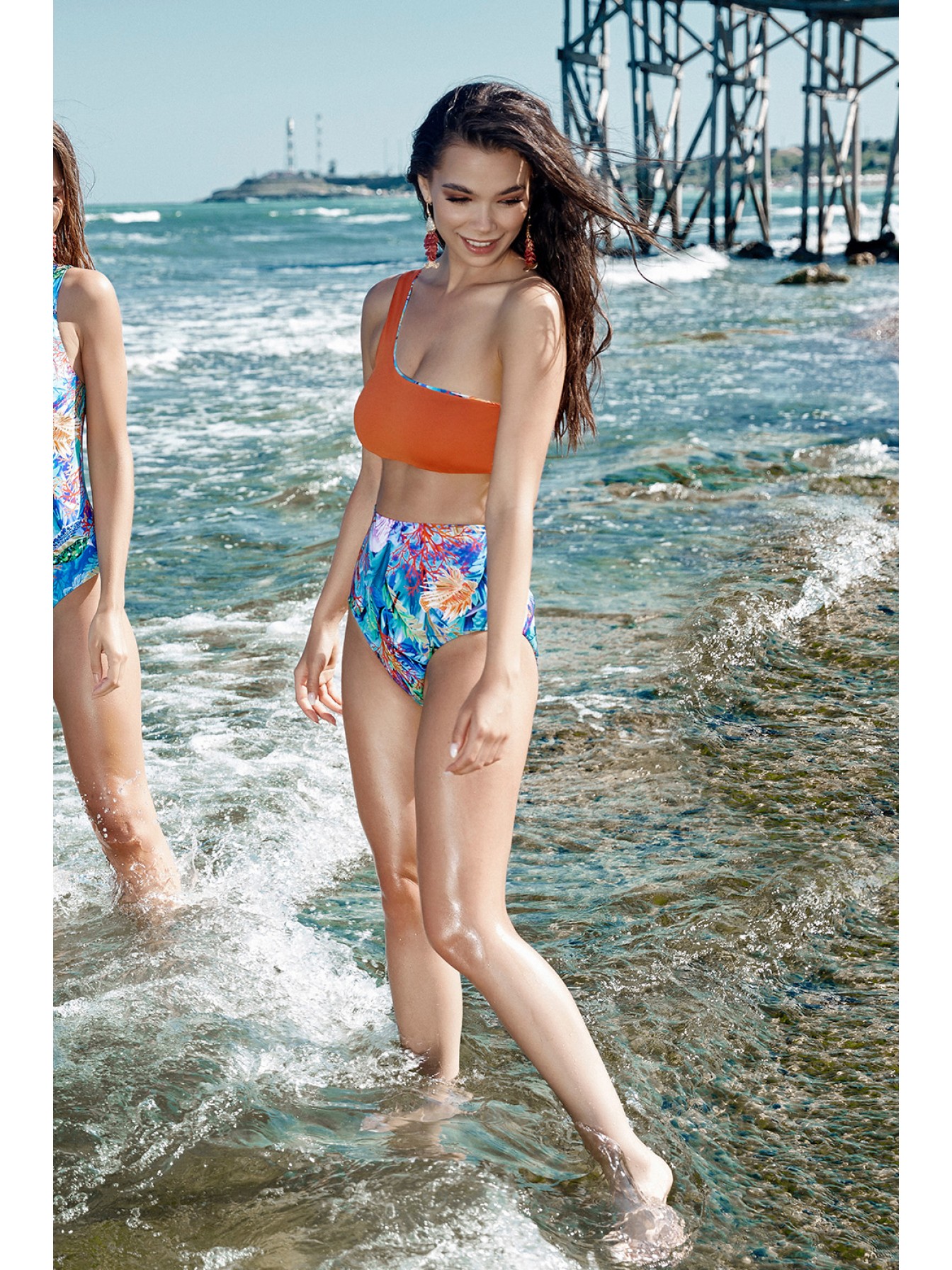 Двухсторонний топ с ассиметричной бретелью из коллекции Ocean Treasures, одна сторона голубого цвета с ярким морским принтом, вторая оранжевого цвета. Сочетайте с любыми плавками этой же коллекции для создания яркого пляжного образа.