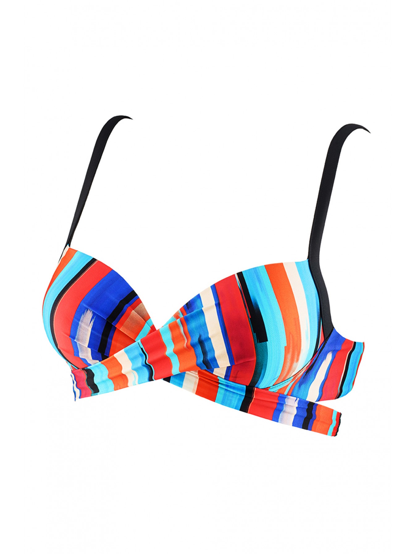 Яркий бюстгальтер с формованными чашками пуш-ап на косточках из коллекции Radiant Colours. Бретели регулируются по длине, на спинке застежка. Дополнен завязки с красивым перехлестом на груди. Сочетайте с любыми плавками этой же коллекции для создания яркого пляжного образа.