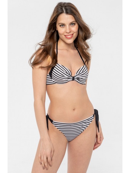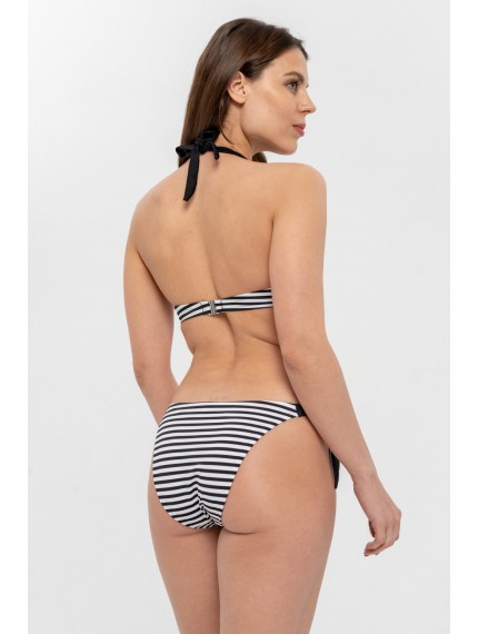 Бюстгальтер-балконет в черно-белую полоску из коллекции Spicy Stripes с формованными чашками пуш-ап с гелевым наполнителем на косточках. Бретели завязывается за шеей, на спинке застежка. Сочетайте с любыми плавками этой же коллекции для создания яркого пляжного образа.